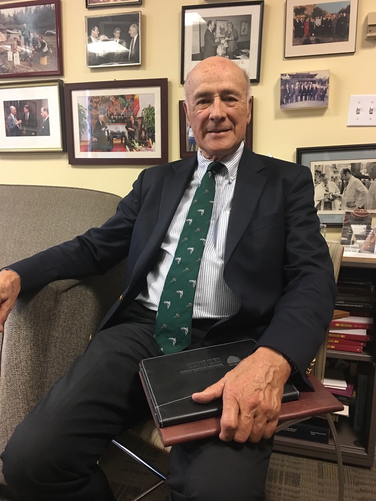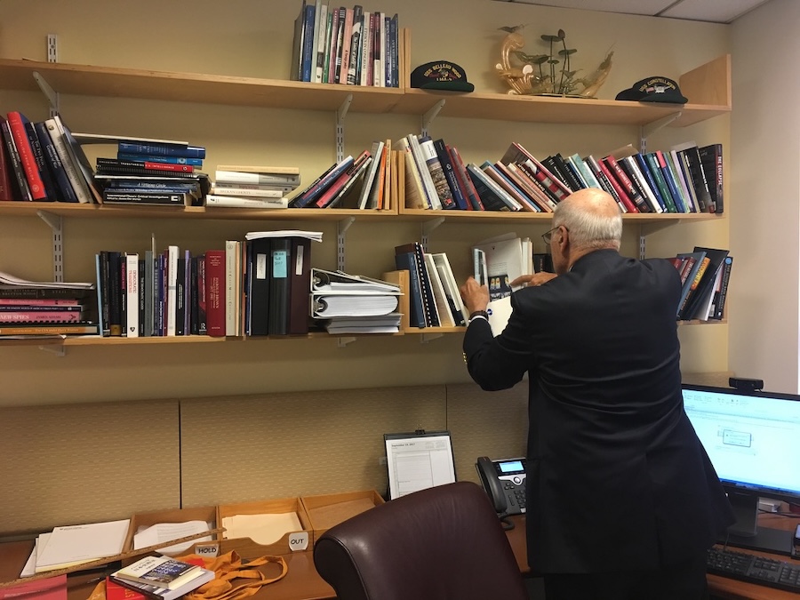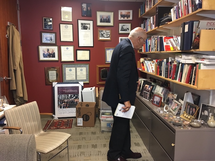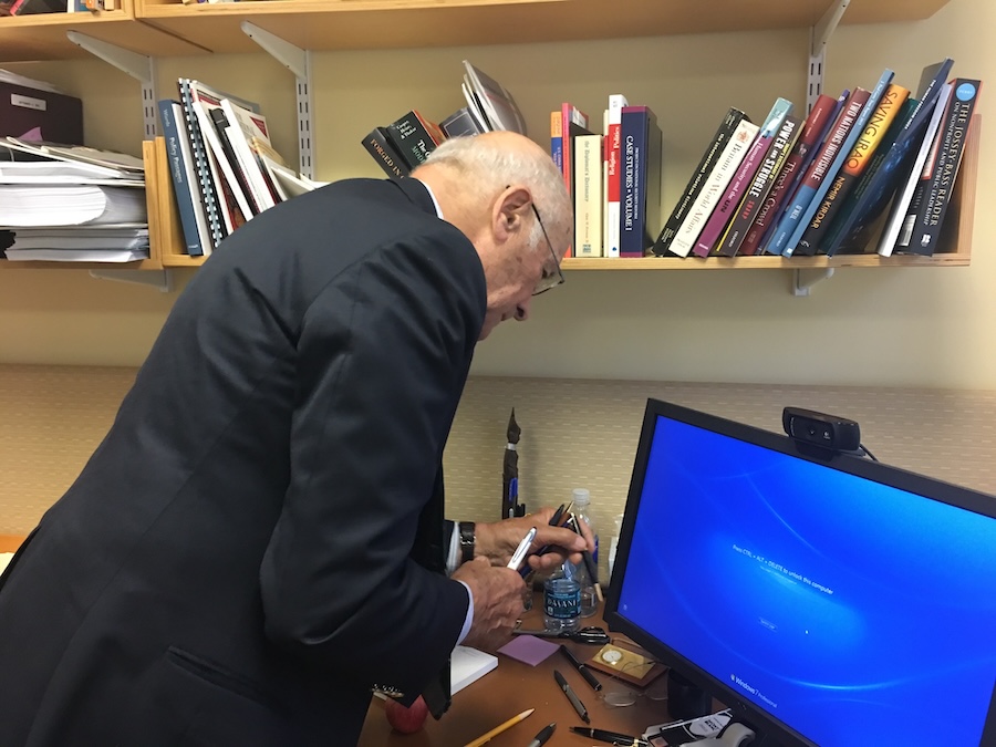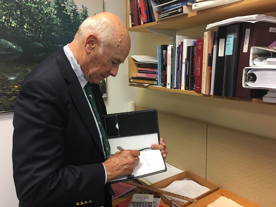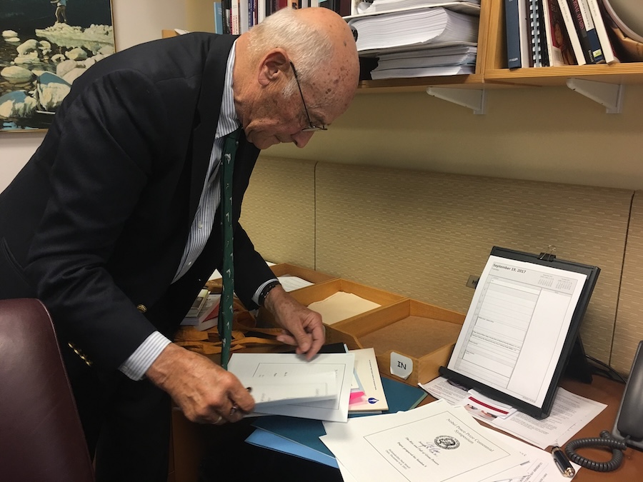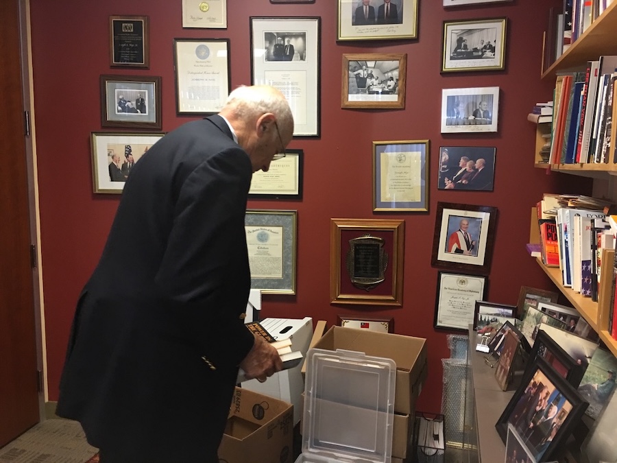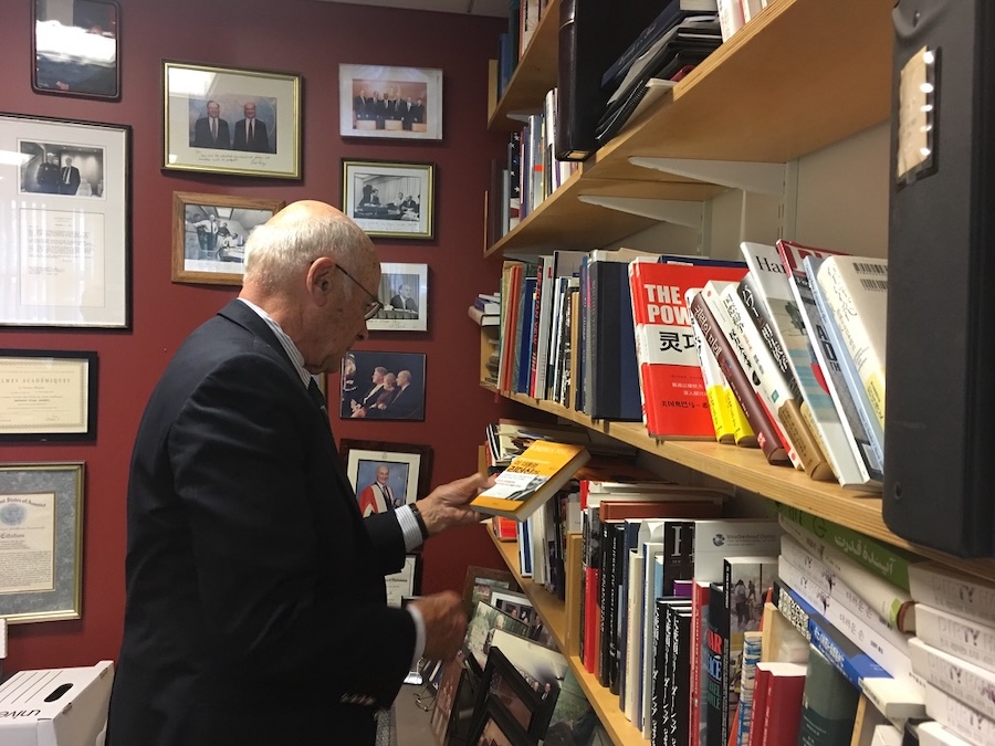 To honor his memory, the Boston Global Forum will introduce a series of photographs capturing Professor Nye’s last moments in his office at the Harvard Kennedy School. On October 11, 2017, as he prepared to conclude his time in that space, Professor Nye presented to BGF the chair he had used for many years, along with two of his personal notebooks and two pens.